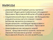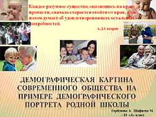 Исследовательский проект «Демографическая картина современного общества на примере демографического портрета родной школы» учащихся 10 класса представленный на школьную ученическую конференцию и занявший 1 место.