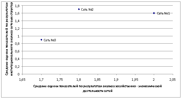 Исходя из данной диаграммы следует вывод, что из трех сетевых структур главными конкурентами являются Сеть №1 и Сеть №2, позиции которых практически равны. Сеть №1 занимает ведущие позиции в области финансово-хозяйственной деятельности, в то время как Сеть №2 опережает своего конкурента по институциональному аспекту деятельности. Сеть №3 значительно отстает от своих конкурентов по обоим видам деятельности.