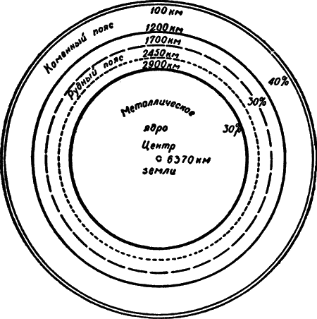 Я вспоминаю, как в 1936 году в Чехословакии я спускался в глубочайшую в Европе шахту в глубины Земли. Мы летели вниз на площадке открытого электрического лифта со скоростью восьми-десяти метров в секунду; свистел ветер, скрипели продольные рельсы, воздух становился влажным и теплым. Через несколько минут мы были на дне шахты: в ушах звенело, сердце усиленно билось, температура вокруг была около 38° — влажная температура тропиков. Ведь мы были всего лишь на глубине тысячи трехсот метров, то есть проделали только одну пятитысячную часть нашего мысленного путешествия к центру Земли. В самой глубокой шахте, которую пробил человек, он смог спуститься только на два с половиной километра (золотой рудник в Африке). Вся деятельность человека, его работа и странствования, его жизнь связаны с маленькой, тоненькой пленкой коры нашей планеты.