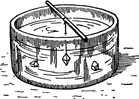 На следующее утро мы увидим, что на дне обоих стаканов выпал осадок маленьких кристалликов; одни очень маленькие, другие побольше. Осторожно сольем наши растворы в стаканы, а сами выберем щипчиками наиболее крупные и аккуратные кристаллики, пять-шесть штук, вытрем их мягкой промокательной бумагой. Теперь очистим от мелкого сверкающего осадка оба кристаллизатора, хорошенько вымоем их и вновь вольем в них наши растворы, а потом осторожно щипчиками положим на дно отобранные кристаллики так, чтобы они не касались друг друга. Мы могли бы сделать еще иначе: накануне опустить в раствор ниточку, которая покрылась бы кристалликами; мы могли бы оставить из них только один или два, а затем ниточку снова опустить в наш кристаллизатор так, как это изображено на рисунке.