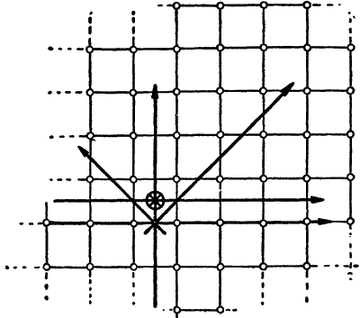 Не знаю, бывал ли читатель когда-либо в еловом лесу, правильно посаженном грядками: вокруг большие деревья идут стройными рядами, и далеко-далеко уходит глаз между ними. Когда вы стоите в точке с кружком, как это изображено на рисунке, такие ряды тянутся направо и налево, вперед и назад. Когда вы отступаете на шаг назад (в место, обозначенное на рисунке крестиком), новые ряды открываются в других направлениях; весь лес перед вами рисуется в виде странной решетки.