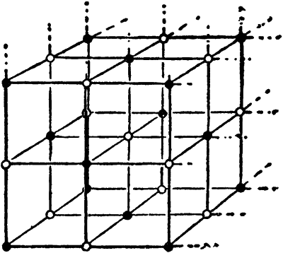 Кристаллическое строение поваренной соли — хлористого натрия. Черные кружочки — атомы хлора; белые — атомы натрия.