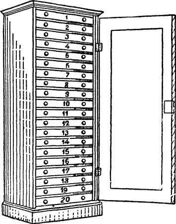 Но вот всё готово для составления коллекции. Что нужно дальше сделать? Прежде всего надо обзавестись специальным шкафом для минералогических коллекций, — лучше всего, если наши коллекционеры умеют столярничать и сделают его сами. На этой странице вы видите такой шкафик — как бы комод: каждый ящик его невысок, сантиметров десять, не больше, а всего ящиков двадцать. В таком шкафу можно хранить до тысячи образцов камней, — это при умелом подборе уже большая коллекция. Если есть очень красивые камни, то хорошо было бы обзавестись и витриной со стеклянными стенками, — тогда можно часть камней и особенно кристаллов красиво выставить в таком шкафике-горке. Далеко не всегда можно обзавестись таким шкафиком с выдвижными ящиками, — тогда можно приспособить неглубокую полку, а чтобы камни не пылились, завесить ее занавеской или большими листами плотной бумаги. Пыль — сильнейший враг минералов: она так глубоко забирается во все извилины камня, что очистить камень далеко не просто, а мыть минералы не всегда можно, так как многие при этом растворяются и портятся.