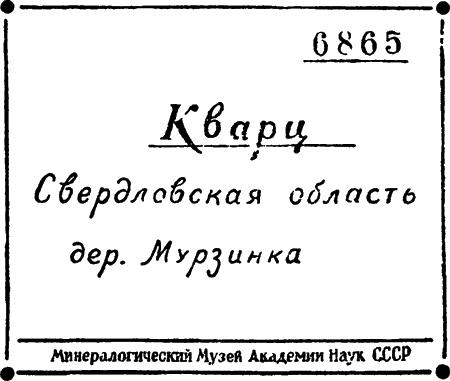 На следующей странице дан образец такой этикетки Минералогического музея Академии наук. На тех подставках, на которых выставляют образец на показ, передняя сторона срезана наискось и на ней-то и делается надпись, но более коротенькая.
