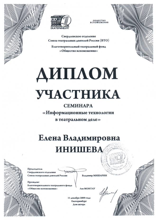 Приложение 1. Диплом участника семинара «Информационные технологии в театральном деле»………………………………………………………………...…. 90