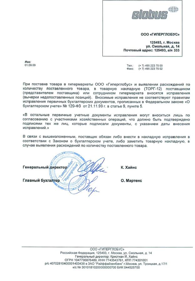 2. За день до поставки поставщик должен выслать по факсу или электронной почте накладную в отдел приемки товара соответствующего гипермаркета «Глобус» (для поставщиков, работающих через EDI – формируют накладные на веб-портале).