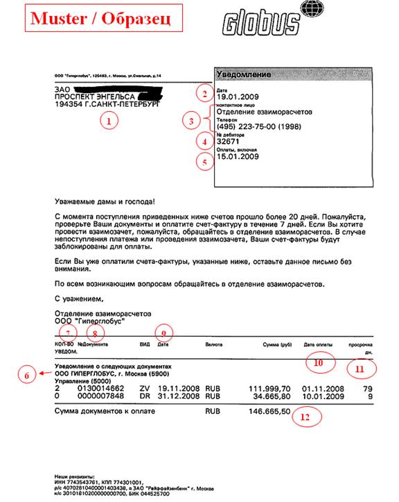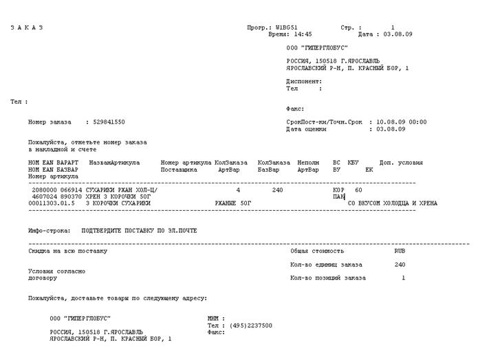 Артикулы в заказах находятся в определенном порядке, который должен быть также соблюден в накладной и счете-фактуре поставщика. В заказе указаны внутренние номера артикулов, присвоенные товарно-складской системой «Глобуса», которые также необходимо указывать в накладной и в счете-фактуре!