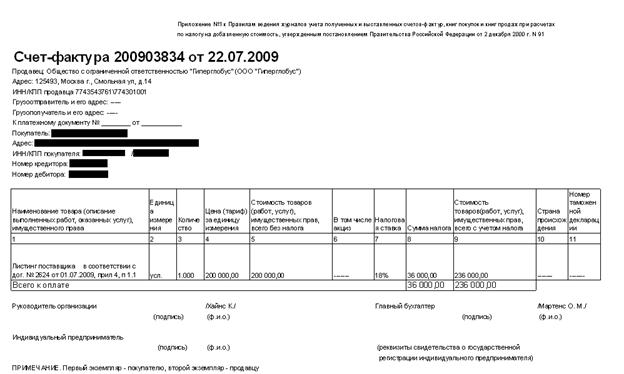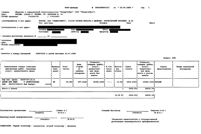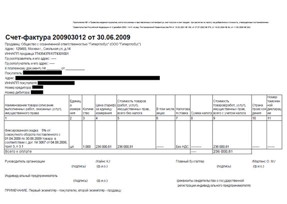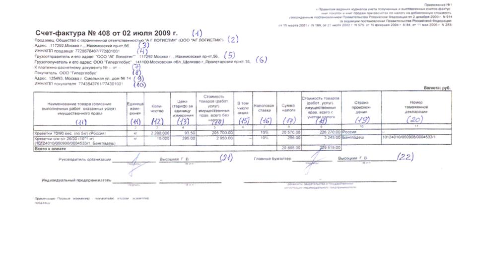 - Может иметь дату позднее даты товарной накладной, но не более 5 дней. (Счет-фактура может быть выписана в течение 5-ти дней после поставки товара) Если продавец и грузоотправитель одно и то же лицо, то в строке может писаться - «он же» Страна происхождения товара и номер таможенной декларации указываются только в том случае, если страной происхождения товаров не является Российская Федерация. В счет-фактуре обязательно указание на соответствующий приказ или доверенность, при подписании счет-фактуры лицом уполномоченным на это. При выставлении счета-фактуры индивидуальным предпринимателем счет-фактура подписывается индивидуальным предпринимателем с указанием реквизитов свидетельства о государственной регистрации этого индивидуального предпринимателя.