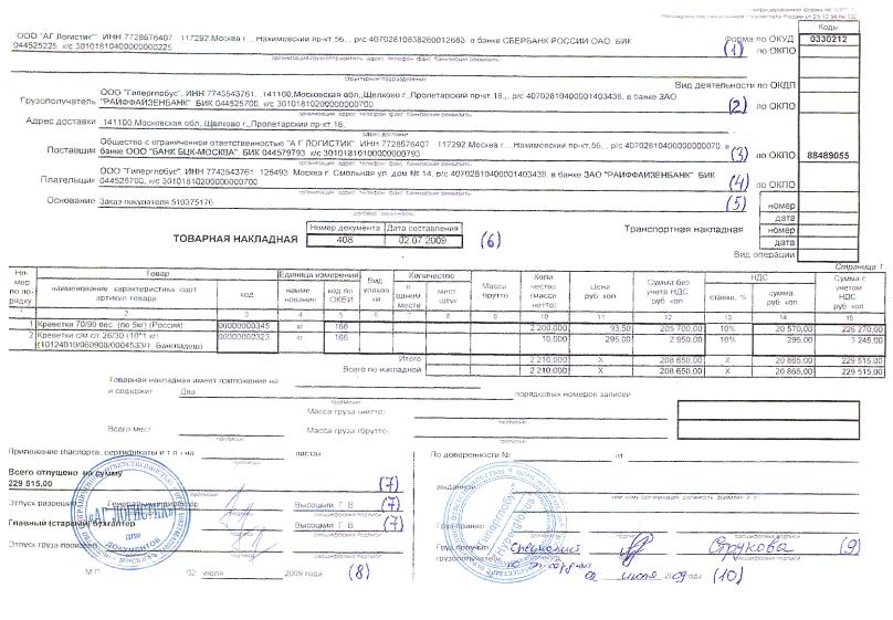 9. «Груз получил грузополучатель» - должна быть подпись сотрудника гипермаркета, который получил товар, должность и расшифровка подписи