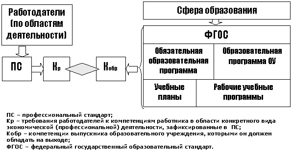 Работодатели через механизм профессиональных стандартов (ПС) сообщают свои требования к компетенциям необходимых им работников (Кр). Сфера образования через свои механизмы (ФГОС, обязательную образовательную программу, контент образовательного учреждения, учебные планы, рабочие учебные программы по конкртеным дисциплинам) формирует у студентов компетенции Кобр, которые соответствуют требованиям работодателя Кр, т. е. через компетенции Кобр, сформированные у него в ходе образовательного процесса, выпускник на выходе обладает необходимыми работодателю компетенциями Кр. При этом зона, обозначенная на схеме ромбом, это область принятия решений сферой образования – чему и в какой последовательности учить студента, чтобы на выходе из образовательного процесса выпускник обладал компетенциями, заявленными работодателем и, соответственно, был востребован на рынке труда.
