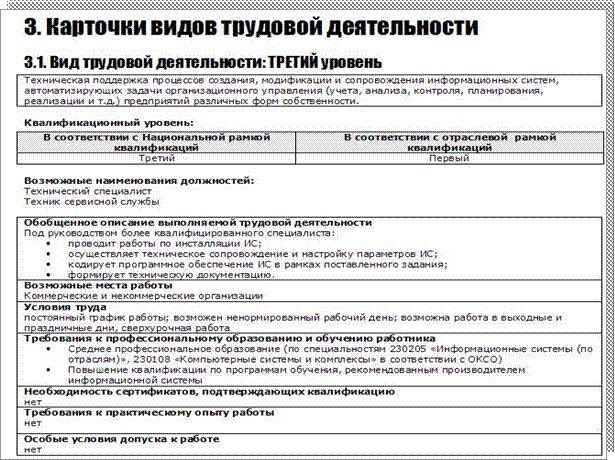 Карточки видов трудовой деятельности (см. Рис. 1) для каждого квалификационного уровня описывают: