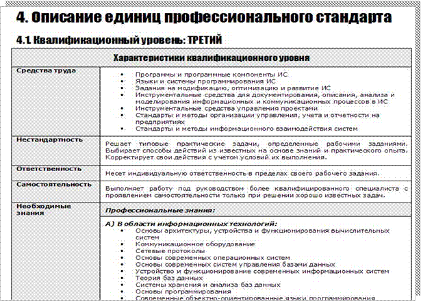 Рис. 3. Характеристики квалификационного уровня на примере профстандарта «Специалист по информационным системам» - вынесены «наверх» перечни знаний и умений, необходимых для выполнения всех единиц профессионального стандарта данного квалификационного уровня.