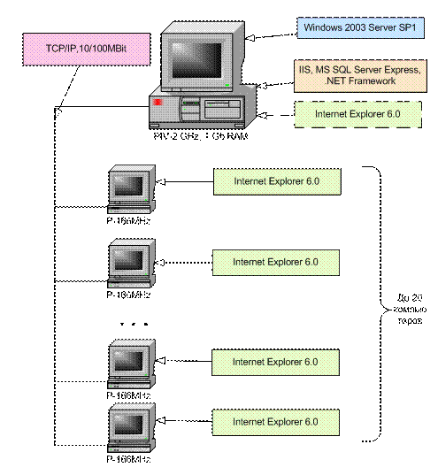 Система построена по трехзвенной архитектуре. С комплексом одновременно работает до 20 машин. Для работы необходим 1 компьютер-сервер.