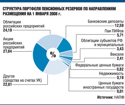 Программы негосударственных фондов охватили около десяти процентов экономически активного населения России. Резерв велик. А сегодня на повестке дня - вопрос о прибыльности пенсионных капиталов при ошеломительном падении котировок акций. Представители всех НПФ едины во мнении: следует изменить структуру инвестиционного портфеля. Сейчас правила игры таковы, что фонды вынуждены закачивать огромные средства в нестабильные финансовые институты с целью получения быстрых дивидендов и благополучной годовой отчетности. Почти 60 процентов вложений сделаны на срок от трех до двенадцати месяцев. В облигациях и акциях российских предприятий - свыше половины пенсионных резервов. На банковских депозитах - 13 процентов. 23 процента средств просто покоятся на счетах управляющих компаний. Тогда как в недвижимость вложено лишь две десятых процента.