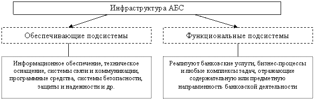 Создание или выбор автоматизированных банковских систем (АБС) связаны с планированием всей системной инфраструктуры информационной технологии банка. Под инфраструктурой АБС понимается совокупность, соотношение и содержательное наполнение отдельных составляющих процесса автоматизации банковских технологий. В инфраструктуре кроме концептуальных подходов выделяются обеспечивающие и функциональные подсистемы [8].