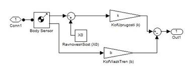 Использование стандартных блоков, моделирующих упруговязкие элементы, Body Spring & Damper и Joint Spring & Damper не удобно, т. к. не позволяет регулировать коэффициент жесткости и коэффициент вязкого трения. Поэтому в модели для моделирования упруговязких элементов создана подсистема, структура которой представлена на рисунке 2.
