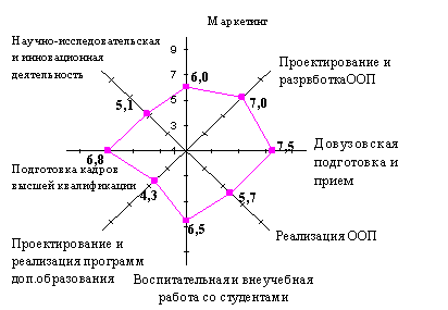 Таким образом, сравнивая данные показатели с максимально возможным значением «10», можно отметить, что все показатели, в большей или меньшей степени, требуют доработки и улучшения, особенно низкие значения имеют: «Проектирование и реализация программ дополнительного образования» и «Научно-исследовательская и инновационная деятельность» в части «инновационная деятельность».