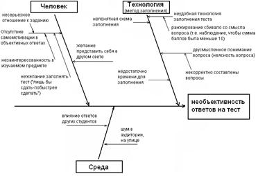 На первом этапе обработке анкет были построены гистограммы для выяснения объективности ответов студентов на тест (если ответы объективны, то распределение будет нормальным). Распределения ответов студентов на тест по каждой из ролей оказались не близки к нормальному распределению, следовательно, существовали какие-то причины таких ответов. Было предположено, что баллы по определенным ролям «подгонялись», т. е. студенты хотели выполнять ту или иную роль. Это предположение было проверено с помощью корреляционного анализа, который имел своей задачей количественное определение тесноты связи между двумя ролями, определенными из теста. Но, проведя корреляционный анализ нельзя было с уверенностью утверждать, что причиной необъективности ответов была лишь их «подгонка», так как коэффициенты корреляции малы, следовательно, нужно было искать другие причины таких результатов теста. Далее причины были определены методом мозгового штурма и нанесены на диаграмму Исикавы: