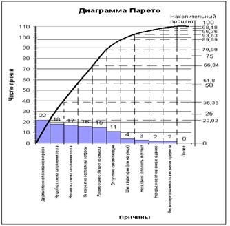 Определив причины и выявив наиболее существенные факторы (причины), влияющие на конечный результат (следствие) с помощью диаграммы Исикавы, далее была проведена стратификация причин, которая показала, что наибольший вклад в наличие необъективности ответов на вопросы внесла «технология» (составила 80% причин необъективных ответов), т. е. технология, метод заполнения анкеты. Продолжая анализировать выявленные проблемы, была построена диаграмма Парето.