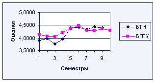 Одним из важнейших процессов вузов является процесс обучения. Одним из показателей, характеризующим выполнение данного процесса, являются оценки студентов, получаемые в результате сдачи экзаменационных сессий. Так как в зависимости от направленности специальности оценки, полученные по разным категориям дисциплин, имеют разное значение, то следует выделять обобщенно социально-гуманитарную, техническую и естественно-научную компоненту образования. Тогда последовательность полученных каждым студентом оценок за весь период обучения представляет собой траекторию векторов в трехмерном (по числу составляющих) пространстве. Совокупность таких траекторий является реализациями случайного процесса и отражает закономерности, присущие процессу обучения. Однако в целях упрощения последующего анализа, рассматривались траектории оценок на плоскости, получающиеся усреднением баллов по всем компонентам. Затем для получения средней характеристики каждой группы находился средний балл по всем студентам группы по семестрам.