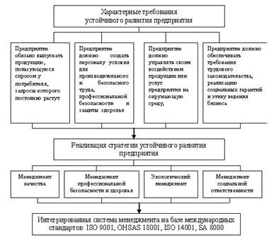 В последнее время инструментами, совершенствующими внутрифирменные системы управления, выступают интегрированные системы менеджмента (ИСМ), которые в общепризнанном понимании являются частью системы общего менеджмента предприятия, отвечают требованиям двух или более международных стандартов на системы менеджмента и функционируют как единое целое. Такие системы позволяют организациям решать экономические, социальные и экологические проблемы с пользой для персонала, общества и государства. Так как предприятие существует одновременно в нескольких «средах», то возможность его устойчивого развития определяется тем, в какой мере ему удается соответствовать требованиям, предъявляемым этими «средами». На рисунке представлена упрощенная схема реализации стратегии устойчивого развития предприятия на основе интегрированной системы менеджмента.