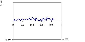 При реализации модели осуществляется перебор всех пор, расположенных правее начальной: xi > x0. Далее выбирается такая точка, для которой значение критерия (1) наименьшее. Выбранная точка полагается начальной, и процесс формирования микропрофиля продолжается. Процесс моделирования развития микротрещины прекращается при x0 = xmax. В соответствии с этим строится профилограмма обработанной поверхности (рисунок 2), по которой рассчитывается параметр шероховатости Ra.
