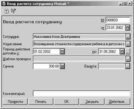 Рис. 66 Пример заполнения экранной формы документа "Ввод расчета сотруднику" на возмещение работнице стоимости содержания ребенка в детском саду