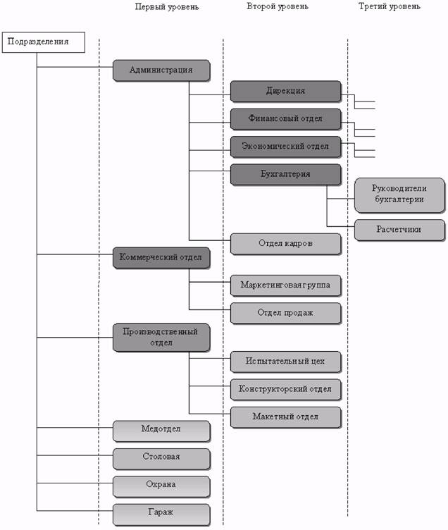 Из представленной схемы видно, что структура организации является древовидной. В организации имеются подразделения, в состав которых входят более мелкие подразделения ("Администрация", "Коммерческий отдел", "Производственный отдел"), а также подразделения, не имеющие в своей структуре других подчиненных подразделений ("Охрана", "Отдел кадров", "Расчетчики"). Первые называются "группами" подразделений, вторые — "конечными" подразделениями. Конечные подразделения могут располагаться как на верхнем уровне (подчинены корню дерева — "Охрана", "Столовая"), так и внутри групп ("Отдел кадров", "Расчетчики"). В общем случае группа подразделений верхнего уровня может также включать в себя более мелкие группы подразделений (группы второго и т. д. уровней). Если подразделение описано как группа, в его состав нужно включить как минимум одно "конечное" подразделение.