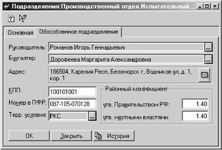 Если в состав организации входят обособленные подразделения, которые в соответствии с действующим налоговым законодательством обязаны платить налоги по месту своего нахождения, то у таких подразделений в форме редактирования элемента справочника устанавливают флажок "Обособленное подразделение". При этом в форме появляется дополнительная закладка, на которой приводится информация о руководителе и бухгалтере обособленного подразделения, фактическое местонахождение подразделения, код причины постановки на налоговый учет по месту нахождения, регистрационный номер в Пенсионном фонде России, территориальные условия для исчисления стажа, районный коэффициент, установленный для местности, в которой находится обособленное подразделение. На рис. 4 приведен пример заполнения закладки "Обособленное подразделение".