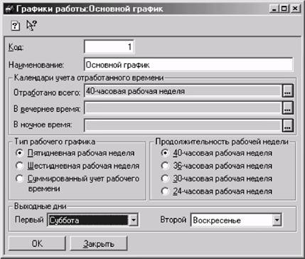 Используемые в организации графики работы описываются в справочнике "Графики работы". В описание входит наименование и тип графика, используемые календари учета отработанного времени, продолжительность рабочей недели и порядок предоставления выходных дней (рис. 21).