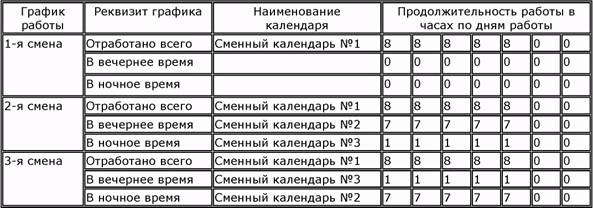 Норма рабочего времени за определенные периоды времени исчисляется по расчетному графику 5-дневной рабочей недели с двумя выходными днями исходя из следующей продолжительности ежедневной работы (смены):
