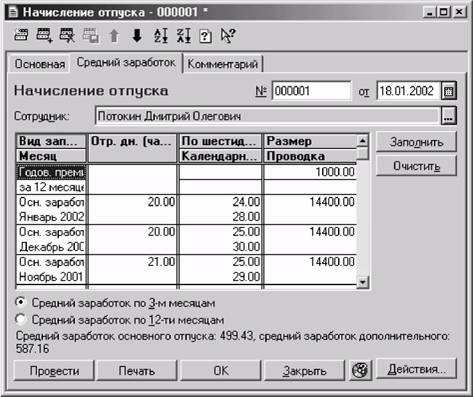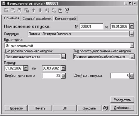 Рис. 46. Пример заполнения экранной формы документа "Начисление отпуска" для начисления компенсации при увольнении