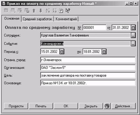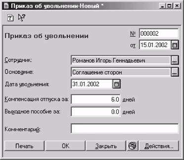 Рис. 45. Пример заполнения экранной формы документа "Приказ об увольнении"