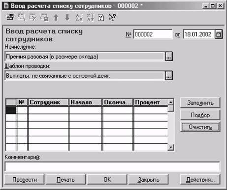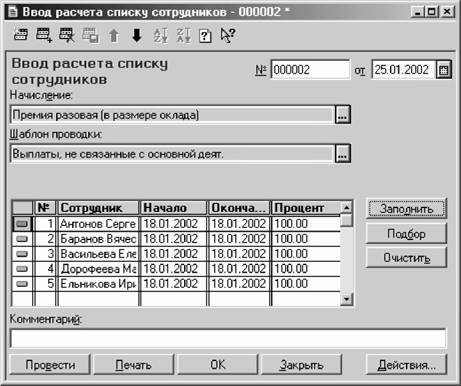 Рис. 44. Пример заполнения экранной формы документа "Ввод расчета списку сотрудников" по начислению разовой поощрительной выплаты