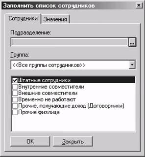 Рис. 43. Форма для отбора лиц, включаемых в многострочную часть документа "Ввод расчета списку сотрудников"