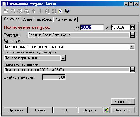 При записи документа программа предложит начислить компенсацию отпуска для увольняемого работника, и в случае согласия - откроет экранную форму документа "Начисление отпуска" (рис. 46).