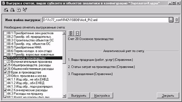 После заполнения справочников типовой конфигурации "Бухгалтерский учет" аналитической информацией, которая имеет непосредственное отношение к учету расходов на оплату труда, из этой информационной базы производят выгрузку данных для конфигурации "Зарплата и кадры". Для этого в меню "Сервис" выбирают пункт "Обмен данными", а затем подпункт "Выгрузка данных в конфигурацию "Зарплата и кадры" и открывают экранную форму обработки (рис. 47).