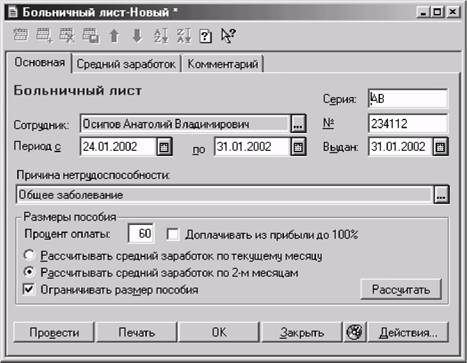 Рис. 58. Пример заполнения закладки "Основная" документа "Больничный лист"