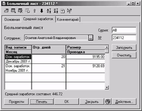 Рис. 59. Заполнение закладки "Средний заработок" документа "Больничный лист"