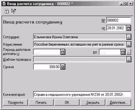 Рис. 60. Пример заполнения экранной формы документа "Ввод расчета работнику" для начисления пособия беременным, вставшим на учет в ранние сроки