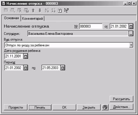 Рис. 62. Пример заполнения экранной формы документа "Начисление отпуска" при оформлении отпуска по уходу за ребенком до достижения им возраста полутора лет