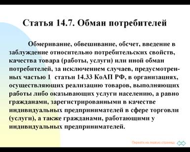 Обмеривание, обвешивание, обсчет, введение в заблуждение относительно потребительских свойств, качества товара (работы, услуги) или иной обман потребителей, за исключением случаев, предусмотренных частью 1 статьи 14.33 КоАП РФ…