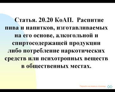 Статья. 20.20. Распитие пива и напитков, изготавливаемых на его основе, алкогольной и спиртосодержащей продукции либо потребление наркотических средств или психотропных веществ в общественных местах.