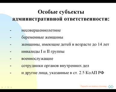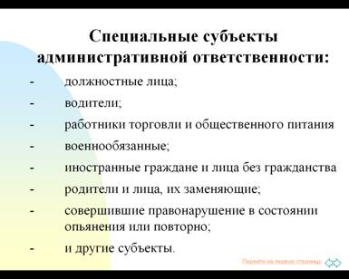 Административная ответственность юридических лиц предусмотрена нормами Особенной части Кодекса и законами субъектов Российской Федерации. Юридические лица не всегда являются субъектами только специфических правонарушений. Субъектами многих правонарушений признаются физические, должностные и юридические лица.