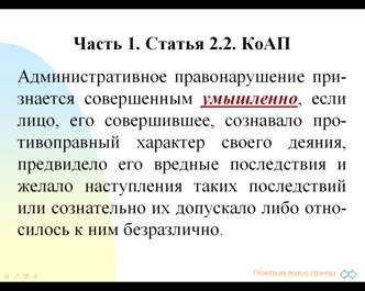 Ст. 2.2 КоАП РФ раскрывает содержание форм вины. Например, административное правонарушение признается совершенным умышленно, если лицо, его совершившее, сознавало противоправный характер своего действия (бездействия), предвидело его вредные последствия и желало наступления таких последствий (прямой умысел) или сознательно их допускало либо относилось к ним безразлично (косвенный умысел).