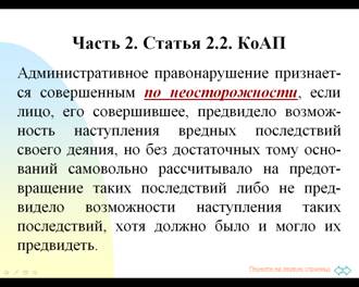 Административное правонарушение признается совершенным по неосторожности, если лицо, его совершившее, предвидело возможность наступления вредных последствий своего действия (бездействия), но без достаточных к тому оснований самонадеянно рассчитывало на предотвращение таких последствий (противоправная самонадеянность), либо не предвидело возможности наступления таких последствий, хотя должно было и могло их предвидеть (противоправная небрежность).
