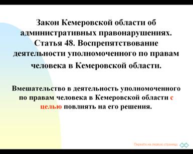Закон Кемеровской области об административных правонарушениях Статья 48. Воспрепятствование деятельности уполномоченного по правам человека в Кемеровской области.