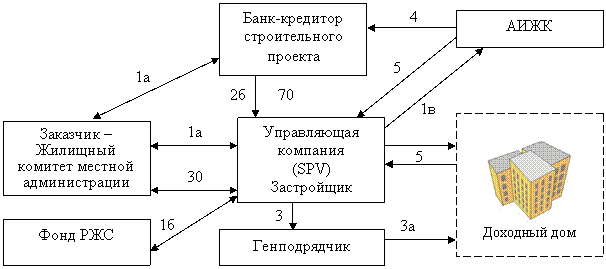 1а. Жилищный комитет учреждает УК в форме SPV с прозрачным балансом, согласовывает с банком строительную и финансовую структуры проекта строительства доходного дома.