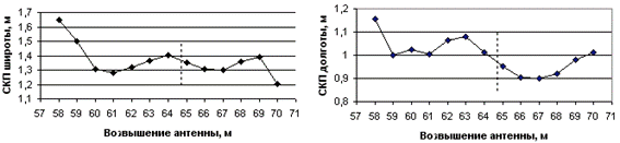 Перечисленные выше факторы вызывают погрешности определения широты, долготы и возвышения антенны над поверхностью геоида. На движущемся судне точные значения широты и долготы в любой момент времени знать невозможно. Вместе с широтой и долготой непрерывно изменяется и обсервованное возвышение антенны над геоидом. В отличие от обсервованных плановых координат точное значение возвышения всегда известно. В первом приближении возвышение антенны судового GPS-приёмника над геоидом – это отстояние по вертикали фазового центра антенны над средним уровнем моря на данной акватории. Ранее автором данной статьи была обнаружена корреляционная зависимость между координатами GPS-приёмника. Следовательно, если заранее получить зависимости СКП широты и долготы от обсервованного возвышения антенны, то, используя эту зависимость, в любой момент времени на судне по обсервованному возвышению можно рассчитать текущее значение РСКП.