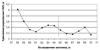 Для получения искомых зависимостей были использованы данные экспериментальных наблюдений за работой приёмника GP-37, выполненных автором осенью 2006 года на базе высокоточного GPS‑полигона Артёмовской топографо-геодезической экспедиции (ФГУП “ПриморАГП”). Из полученных данных для каждого значения возвышения от 58 до 70 метров были сформированы 13 массивов, состоящих из соответствующих им пар значений обсервованных широт и долгот. Массивы, соответствующие возвышениям более 70 и менее 58 метров, не формировались, поскольку там объёмы выборок были меньше 11000 пар широт и долгот. Затем по каждому массиву были рассчитаны СКП широт и долгот, выраженных в минутах и в метрах, а также удвоенные радиальные СКП в метрах. Результаты этих вычислений можно видеть в табл. 1.